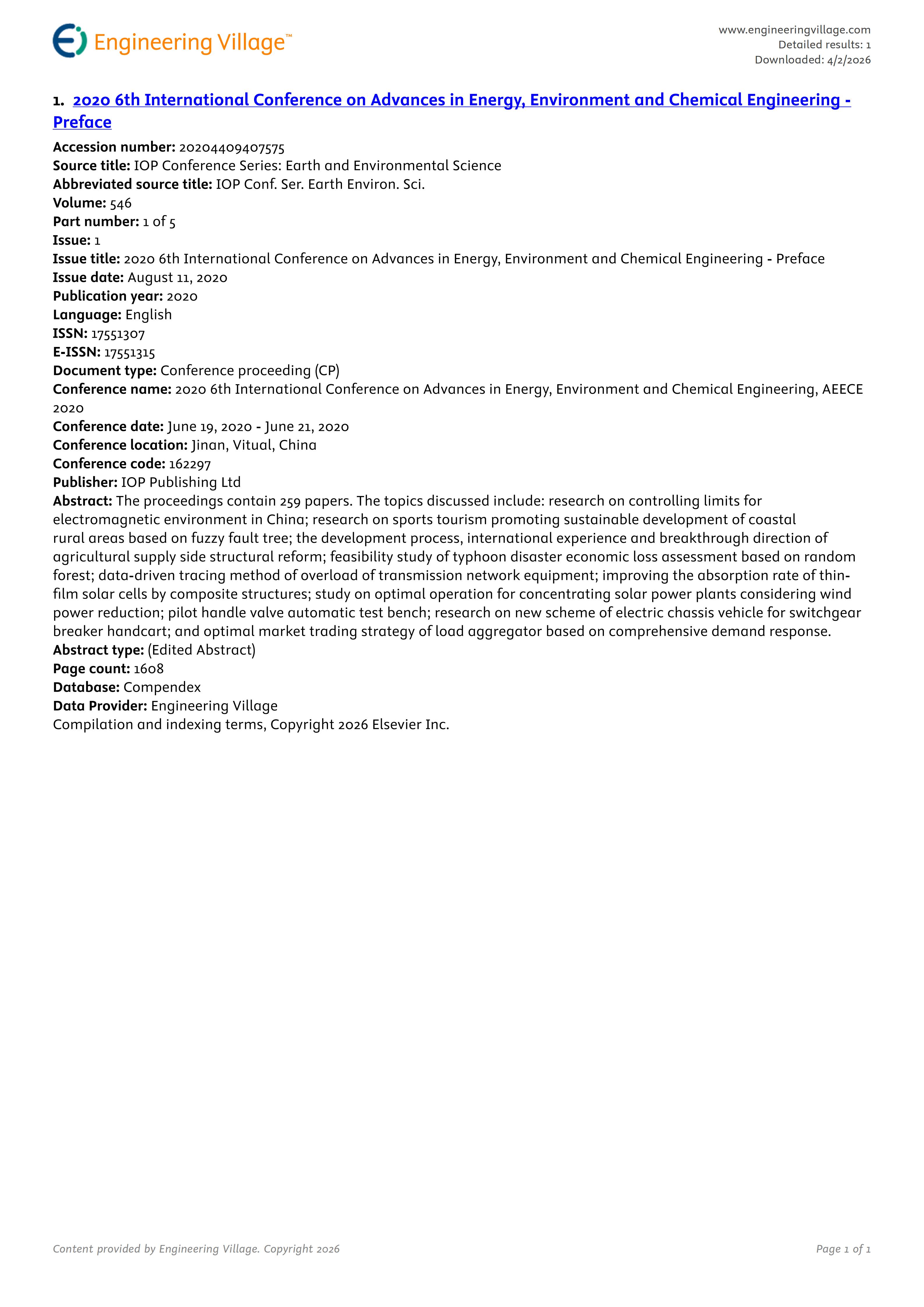 The 6th International Conference on Advances in Energy, Environment and Chemical Engineering (AEECE 2020) has been held successfully in Jinan, China, during June 19-21, 2020.